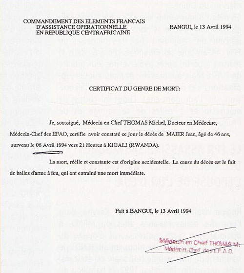 Ce triple assassinat n’a donné lieu à aucune instruction judiciaire, contrairement à l’attentat contre l’avion du président Habyarimana, le 6 avril à 20h 30 qui a coûté la vie à trois Français. Tant de contradictions font question et il est probable que les autorités françaises cachent la vraie raison de la mort de ces deux gendarmes et de l’épouse de l’un d’eux.