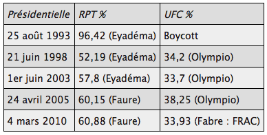Depuis la redécouverte démocratique au début des années 1990, les cinq présidentielles concurrentielles que le Togo a connues ont reconduit des résultats pratiquement identiques en donnant toujours la victoire au parti au pouvoir comme le montre le tableau ci-dessous.