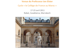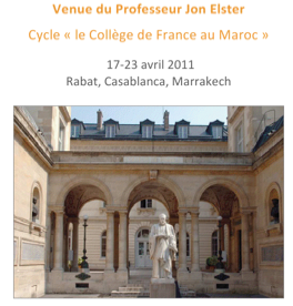 Dans le cadre du cycle « Le Collège de France au Maroc », le professeur Jon Elster, titulaire de la Chaire « rationalité et sciences sociales », animera une série de conférences dans les villes de Rabat, Casablanca et Marrakech du 17 au 23 avril 2011.