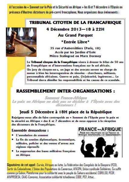 Ce mercredi 4 décembre, le tribunal citoyen de la Françafrique se tiendra de 18h à 22h au Grand Parquet, 35 rue d’Aubervilliers, M° Stalingrad ou Marx Dormoy, avec de nombreux témoignages et prises de paroles d’intervenants et de militants.